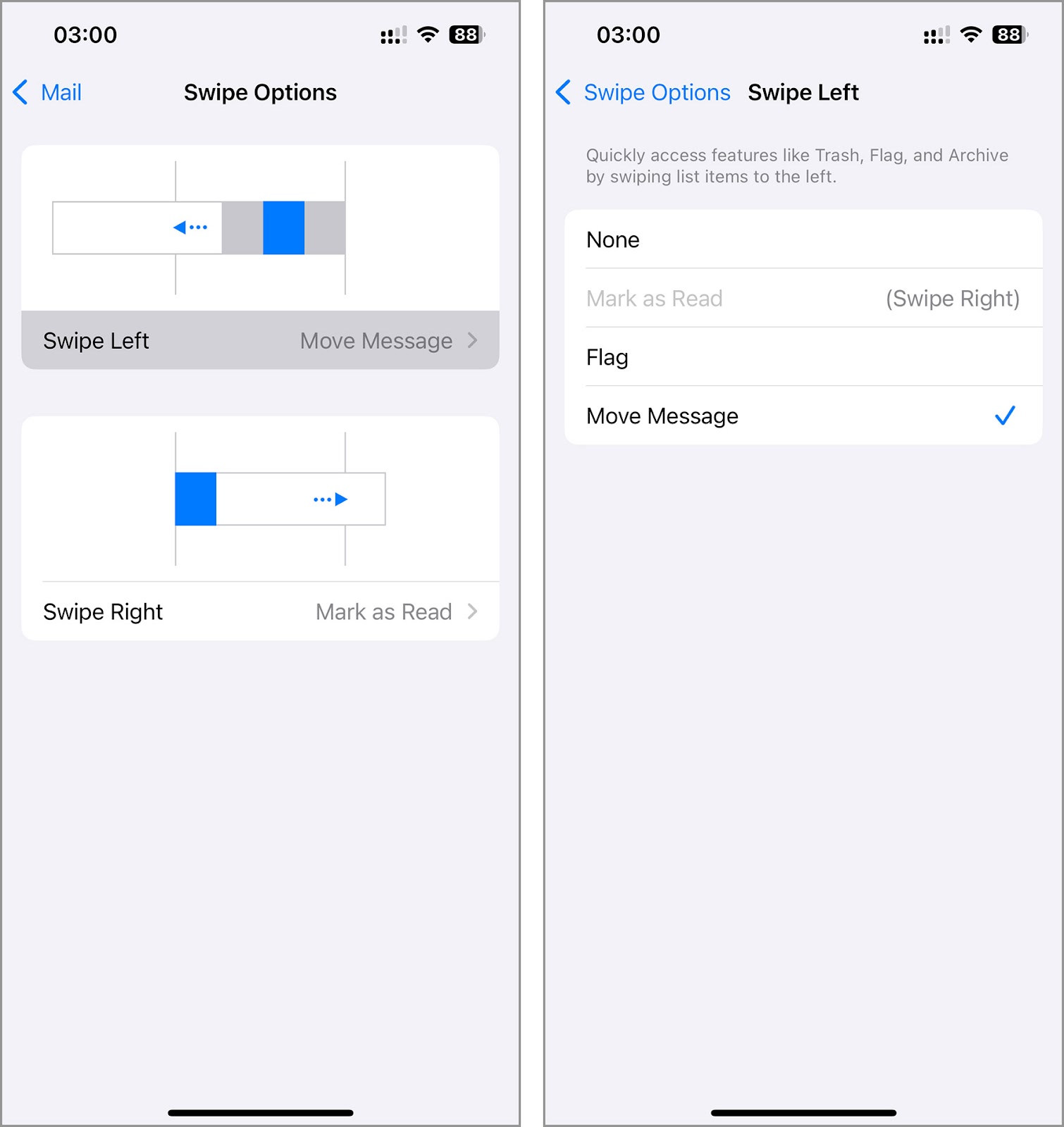 Step 4 - Tap on ‘Swipe Left’ and set it to ‘Move Message’ from the options presented.Step 3 tap Swipe Optionsjpg