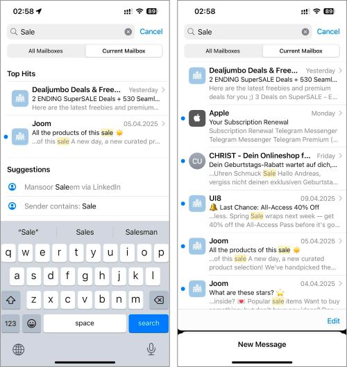 Step 2 - Tap the search bar at the top and type in keywords like “sale,” “offer,” or “unsubscribe.”iphone step 4 junk mail