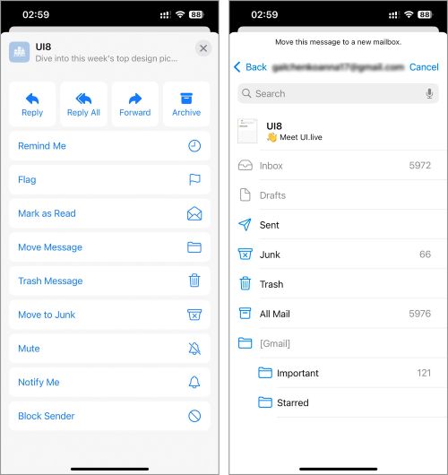 Apart from using swipe gestures, you can also opt to delete junk mail individually by opening each email and assessing its content. To do this, access your inbox > open the email, and reread its contents > then click the folder icon > Junk or Trash.