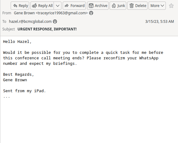In a minimal text spear phishing email attack, the email may be short, typically only a sentence or two, and often includes a link or an attachment that the attacker wants the target to click on. The cybercriminal will use a tone of urgency by claiming that the link or attachment contains essential information that requires immediate action. This will convince the target to click on the link or attachment without considering the possible repercussions.
