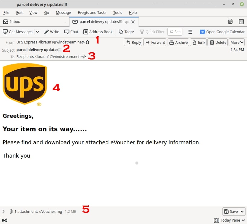 This is a phishing attempt we caught that tries to use our familiarity with common brands (1 & 4) to gain the trust of the recipient and lower our guard enough to click the file attached to the email. Once the recipient opens and clicks on the attachment, a javascript application runs on the victim's computer, building a backdoor to the cyber criminal’s network where they can take control of the computer to be used in other attacks.