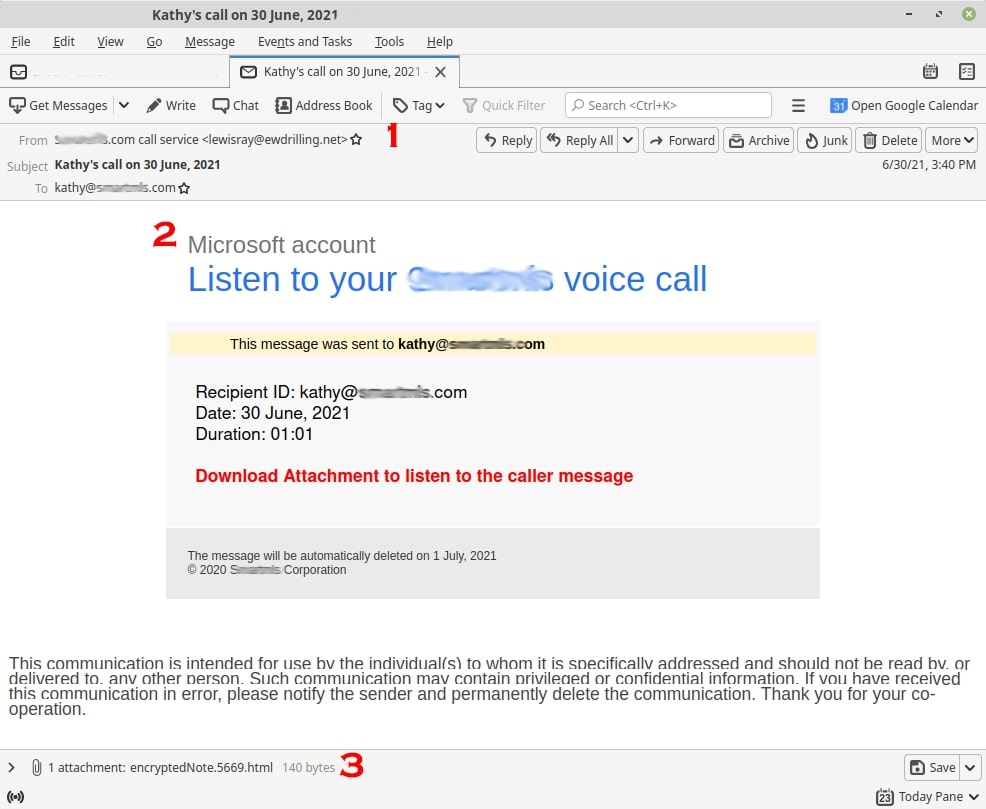 - Generic From address contains unrecognizable sender with no relation to any voicemail service
