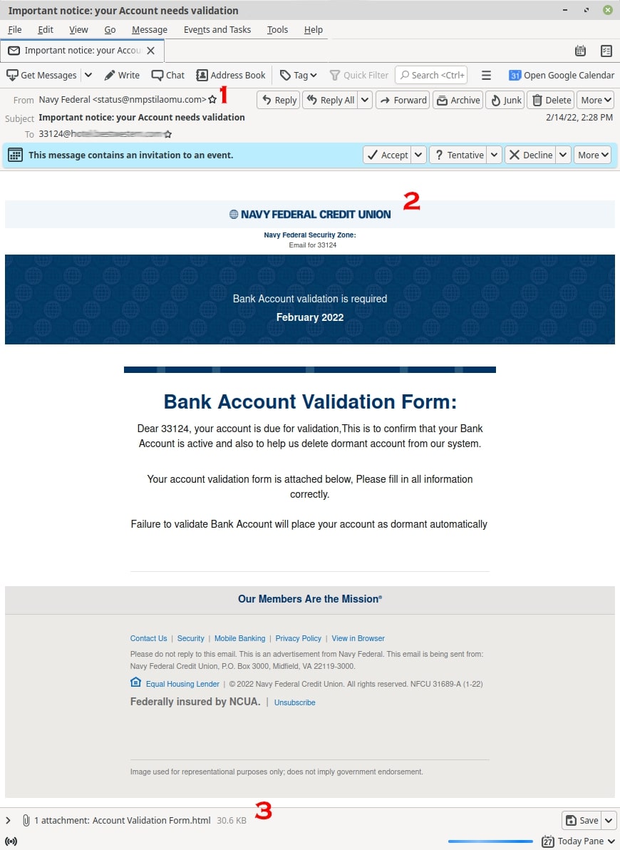 However, this spear-phishing email and the included attachments are designed to trick the recipient into providing their login details to the threat actor, who can then use your credentials to login to the real NFCU website on your behalf, siphoning your finances into their own bank account.
