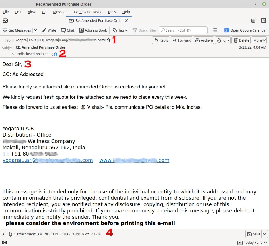 This email contains what appears to be an updated purchase order. If you were anticipating a purchase order, you may be more inclined to investigate further to see if this was it. You’ll notice it’s very nondescript, which may motivate the recipient to click the attachment to find out more.