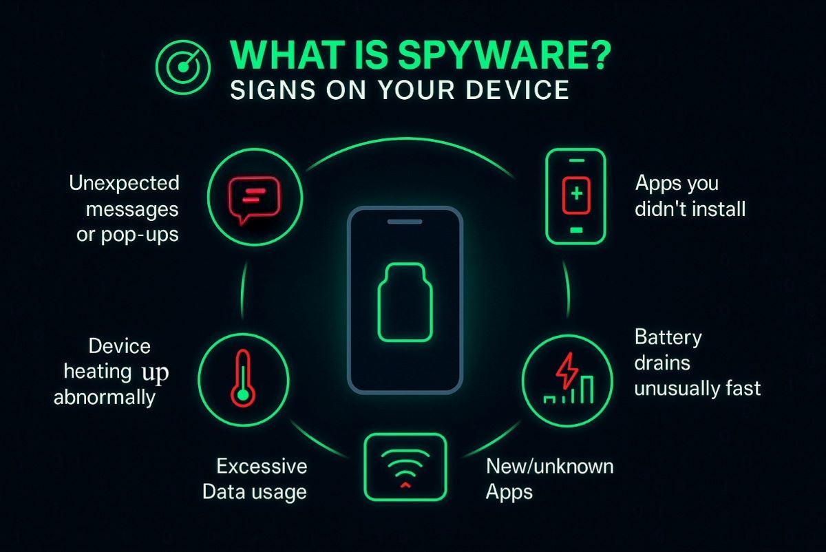 No matter if you’re on an iPhone, Android, or computer, the signs are similar. Watch for small changes in how your device behaves. Here are a few to check:What is Spyware: Device Risks